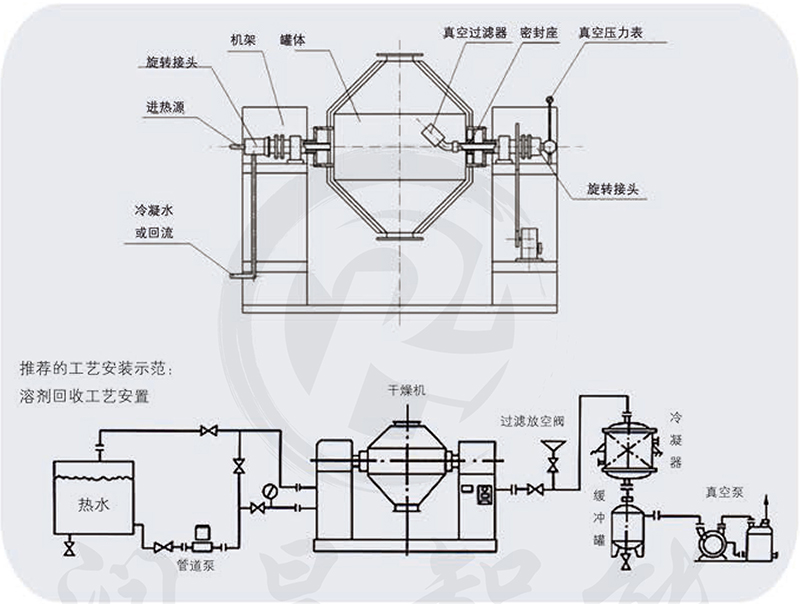 本机适用于医药、食品、化工等行业的粉、粒状物料的真空干燥和混合,尤其适用于有下列要求的物料:不能承受高温的热敏性物料:容易氧化,有危险的物料:需回收溶剂和有毒气体的物料:要求残留挥发物含量极低的物料:要求混合充分,均匀的物料;