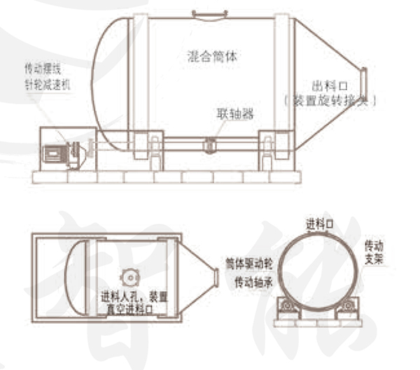 本设备广泛应用于医药、食品、化工、饲料、农药行业中的干粉、粒料的混合机。