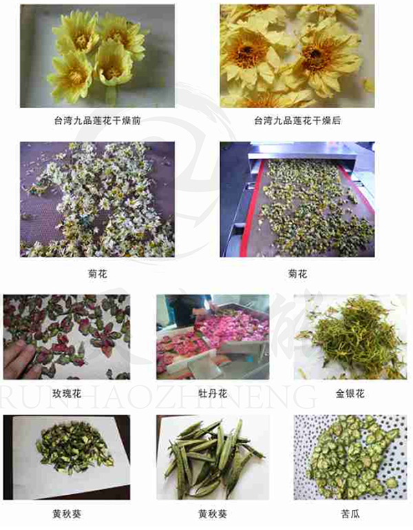 本设备适用于牡丹花,金银花,玫瑰花,菊花等花类的杀青,干煽,大产量的农副产品干燥,具有干燥速度快干燥均匀等特点,不破坏解花的颜色,形状,并带有水分收集装置同时杀除鲜花内的虫卵,延长产品的保腾期。